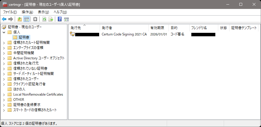 今回取得した証明書が追加されていることを確認します。