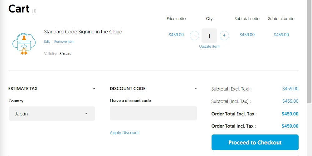 [validity]から"3 years"を選択し、[Add to Cart]ボタンを押します。