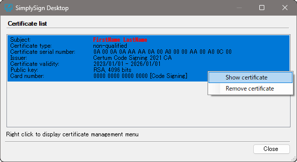 Hello, certificate Standard Code Signing SimplySign with serial number 1a234b5cdefa6b78c90123de45f67a89 for FirstName LastName has been issued. The certificate will expire on DD.MM.YYYY HH:MM UTC+1