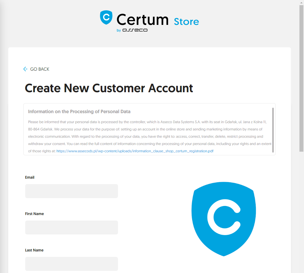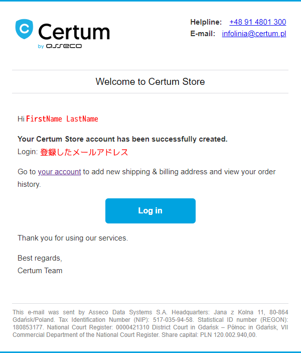 | Subject | Confirmation of creating new account in Certum Store |