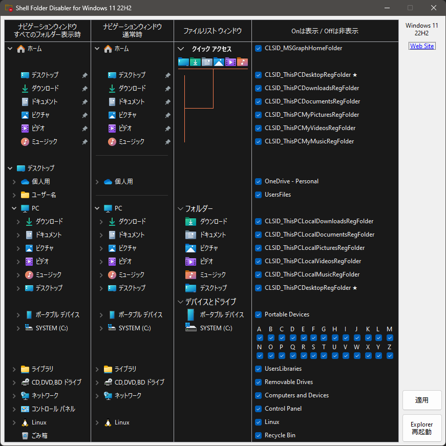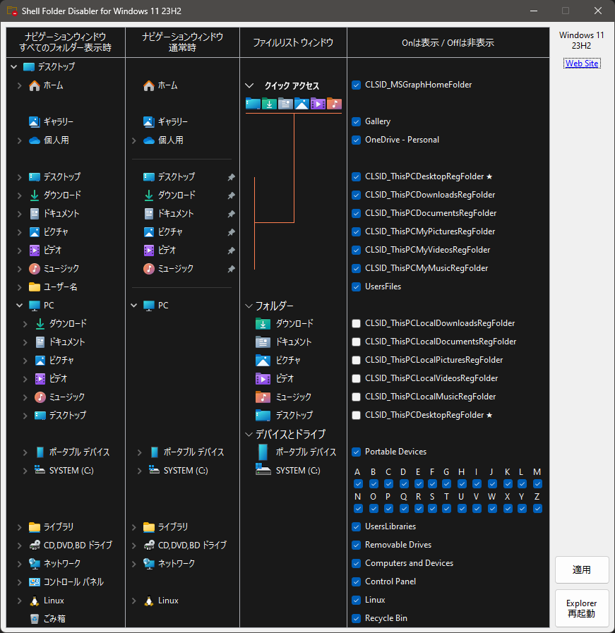 Explorerの配置と一致しているので、わかりやすいと思います。 また、23H2と22H2で、微妙に配置が違うし、 対応するレジストリが違うので、それぞれにあった対応をしています。 [デスクトップ]のチェックボックスに[★]印が付いていると思いますが、 同じレジストリーを参照しているため、 [ホーム]配下の[デスクトップ]を非表示にすると、 [PC]配下の[デスクトップ]も非表示になって今います。 23H2はもともと、非表示なので、特に問題はないかもしれません。 |