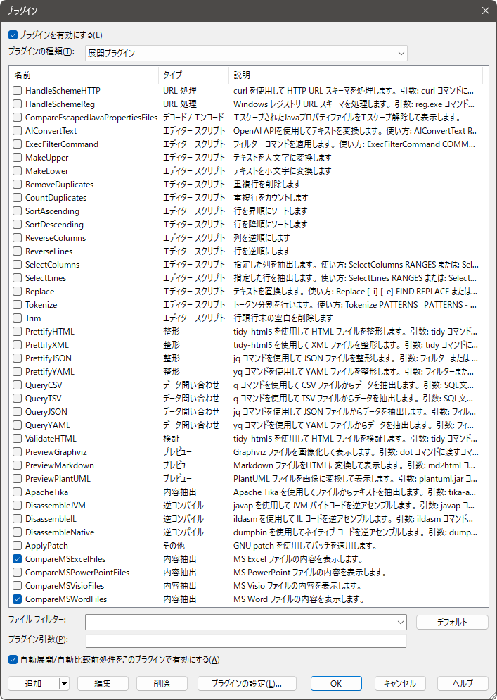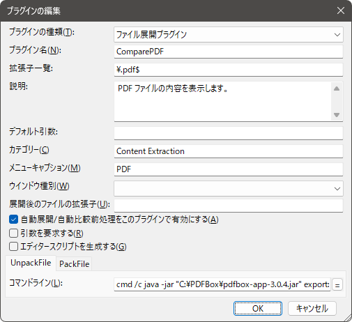 ウインドウ種別 展開後のファイルの拡張子 自動展開/自動比較前処理をこのプラグインで有効にする チェック を入れる 引数を要求する エディタースクリプトを生成する UnpackFile