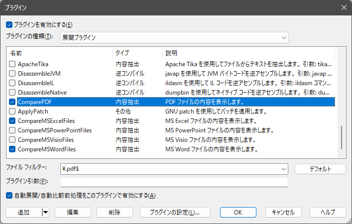 プラグインの種類 "ファイル展開プラグイン" を選択します プラグイン名 ComparePDF