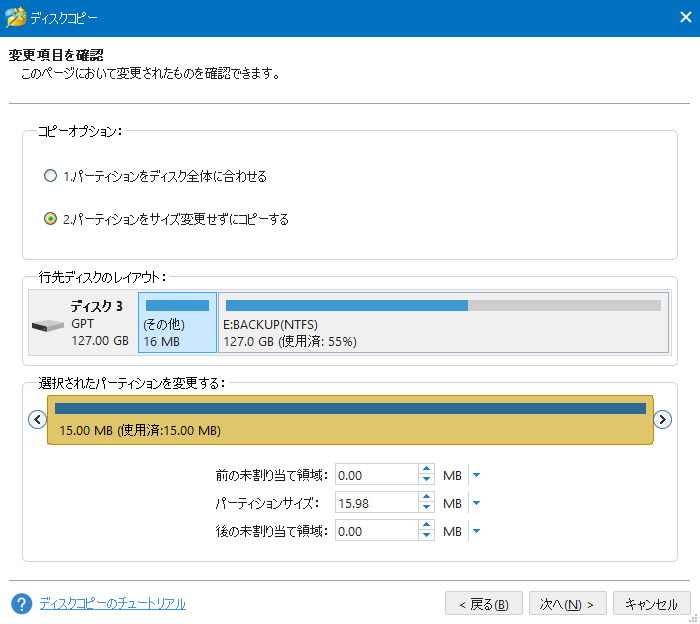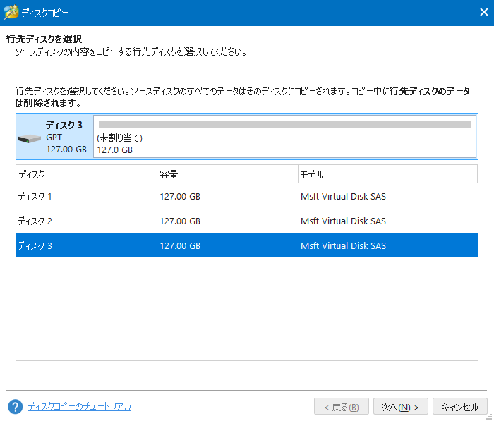 同容量のディスクに移行するなら、[2]を選択し、[次へ]ボタンをクリックします。