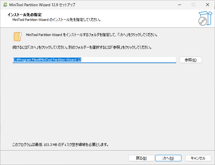 インストール先を指定し、[次へ]ボタンをクリックします。