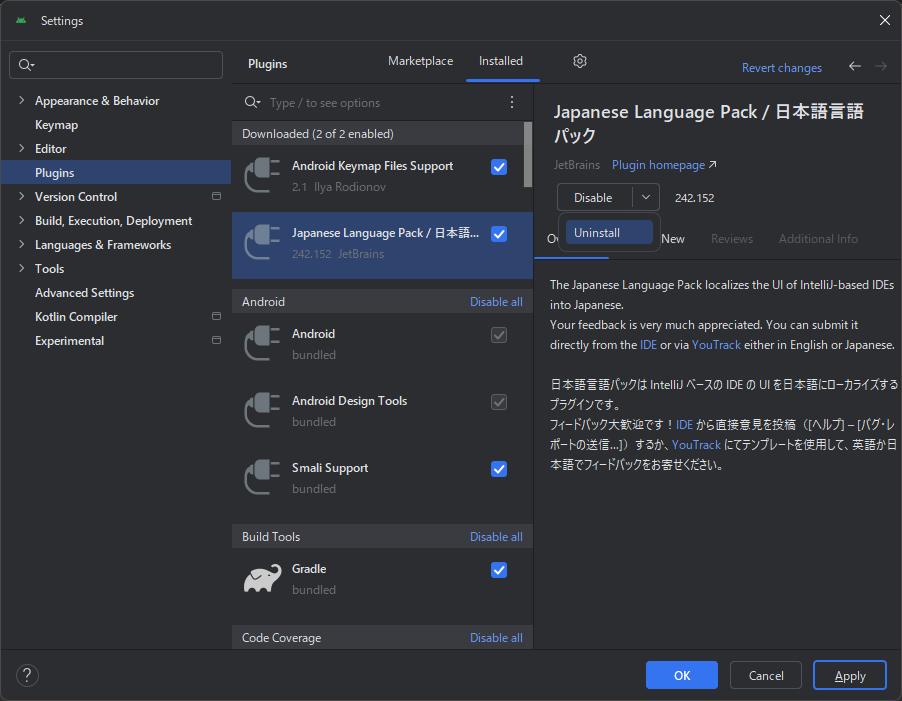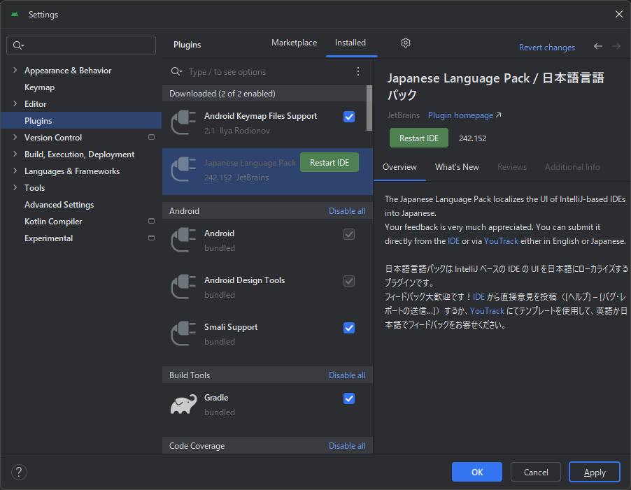 - Android Studioは、日本語パックをバンドルしてくれていない。