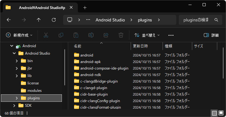 Explorerで、"Android Studio\plugins"フォルダーを開き、