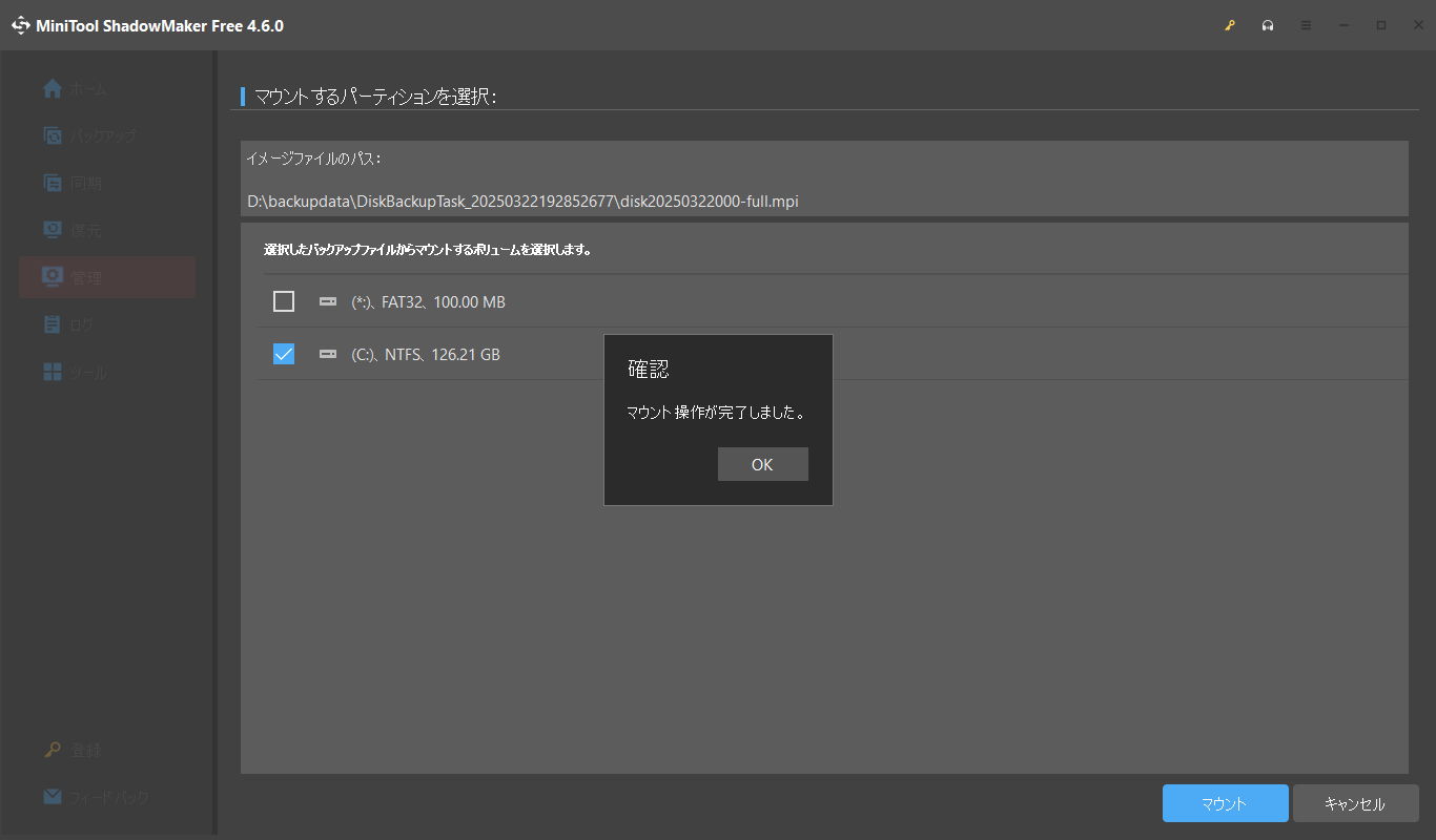 12.マウントされると、確認ダイアログが表示されるので、[OK]ボタンをクリックします。