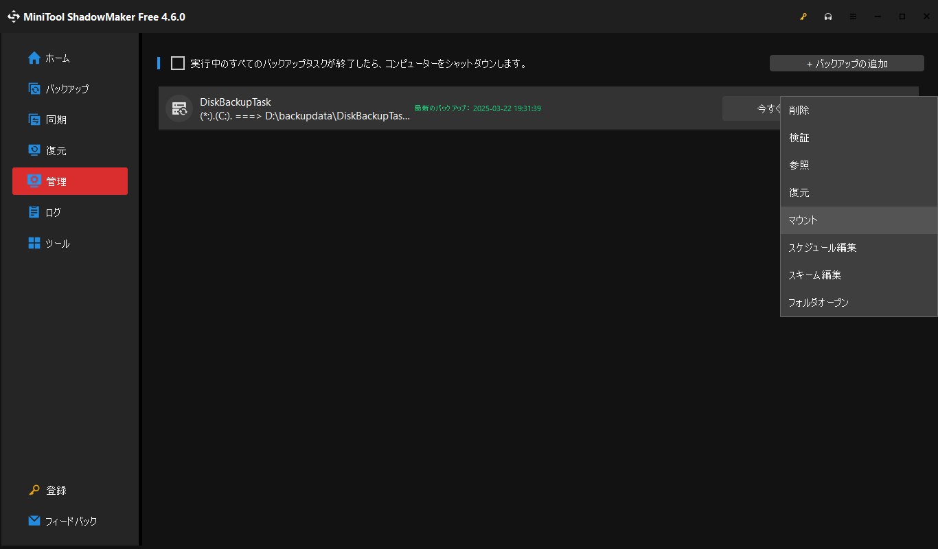 8.バックアップした中身を確認するには、[マウント]を選択します。