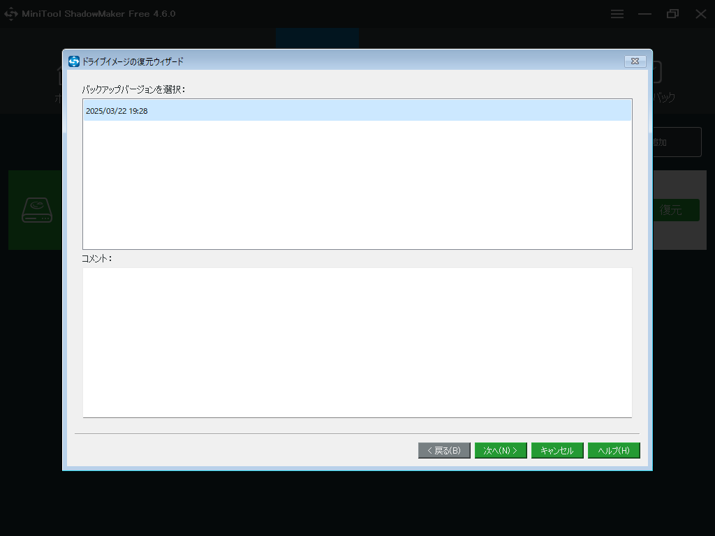 9.バックアップした日時を確認し、[次へ]ボタンをクリックします。