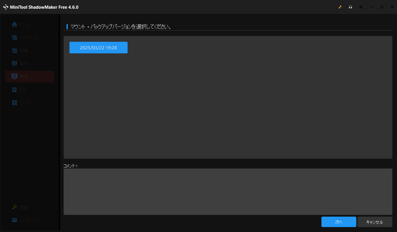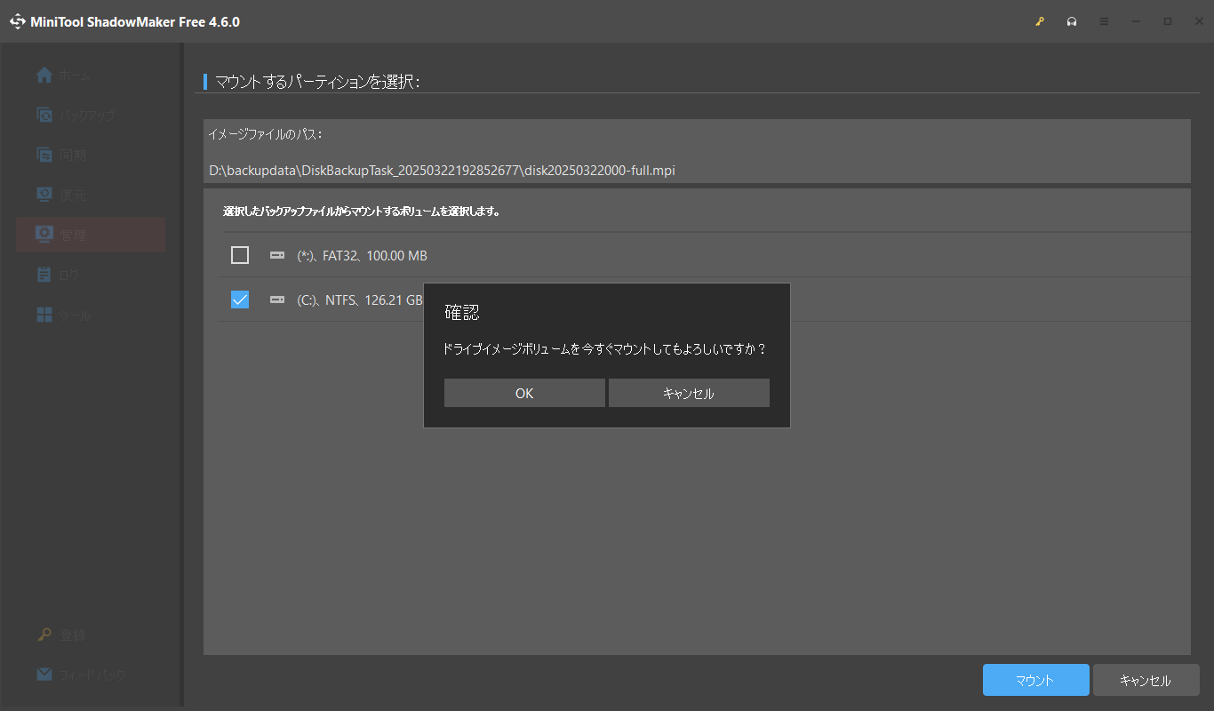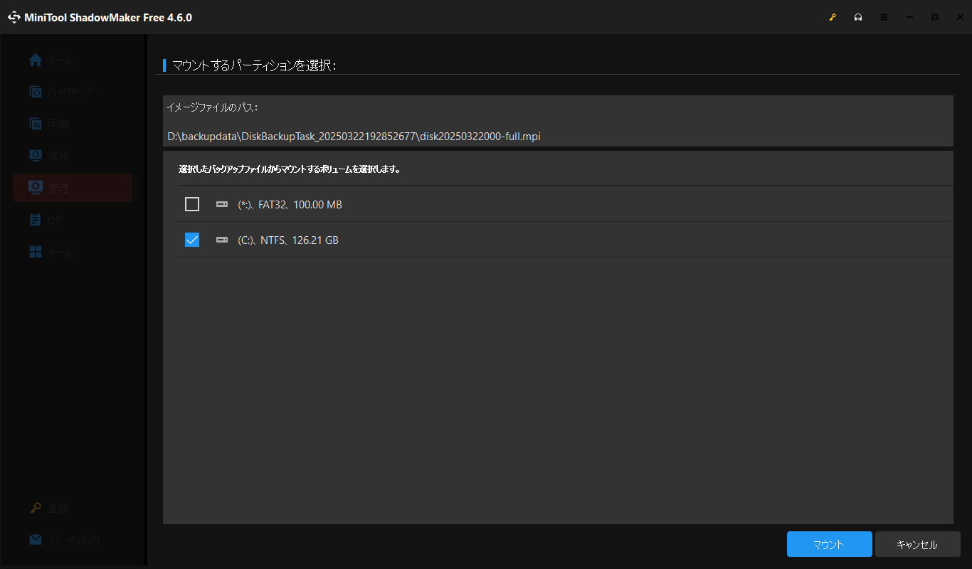 ここでは、バックアップしたCドライブをマウントすることとします。