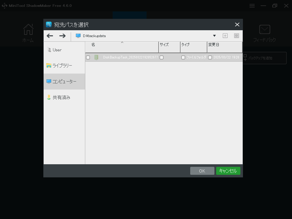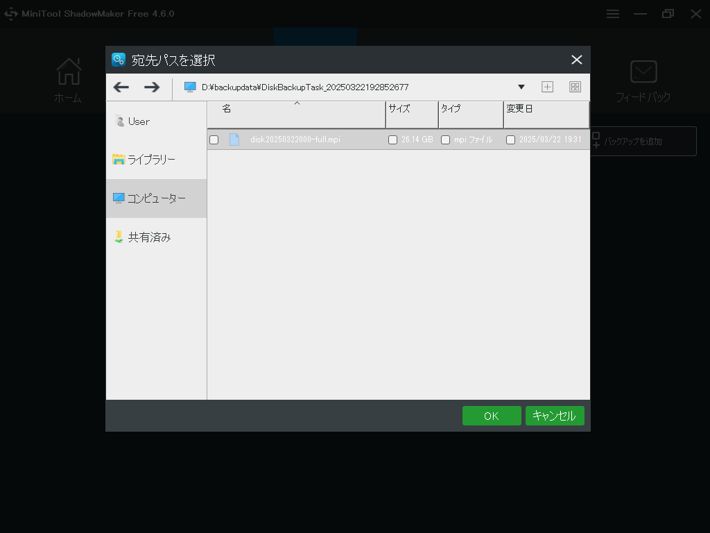 18.バックアップファイルを選択し、[OK]ボタンをクリックします。