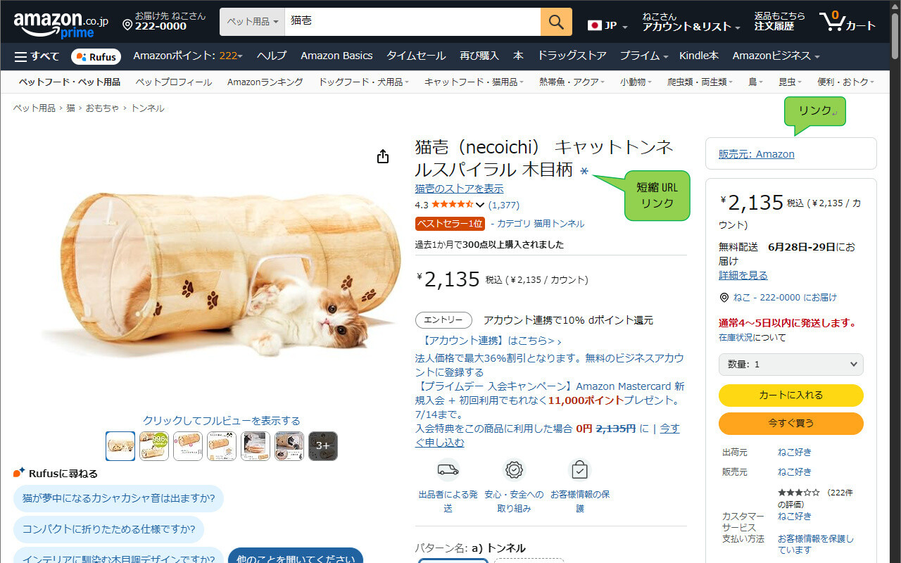 '販売元:Amazon'リンクおよび、'短縮URL'リンクを追加します。